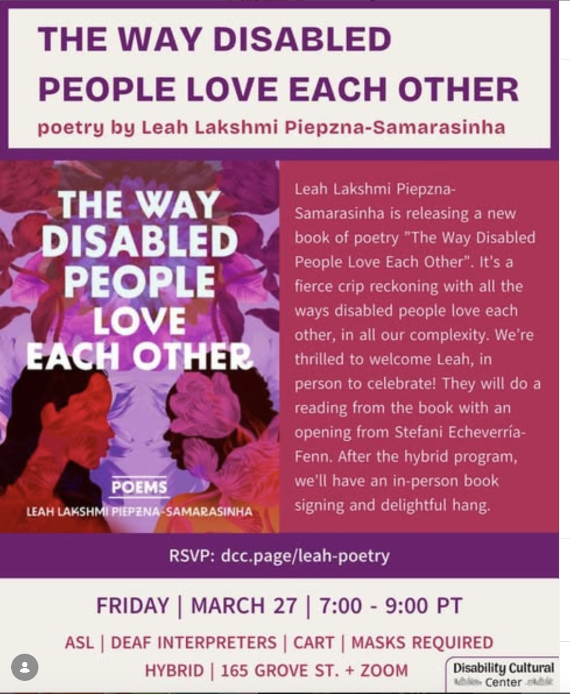 ![Against a background of illustrated magenta flowers that fades out into light pink, header text reads, "The Speak/Easy Tour: The Way Disabled People Love Each Other by Leah Lakshmi Piepzna-Samarasinha." Below is description text along with the cover of the book and the beginning of the list of events. The description text reads, "Join Lambda Award–winning poet, memoirist, and disability justice movement worker Leah Lakshmi Piepzna-Samarasinha as they launch their long-awaited fifth collection of poems, The Way Disabled People Love Each Other—a fierce crip reckoning with all the ways disabled people love each other, in all our complexity." A small note reads, "Wheelchair access: All in-person events are wheelchair accessible." Under a subheading reading, "Book Tour Events," the list of events begins as follows: "San Francisco, [California], Fri, March 27, 7:00 p.m., Disability Cultural Centre: With Stefani Echeverría-Fenn and Tre Vasquez. Masked in-person and hybrid event with ASL. Sales courtesy of Medicine for Nightmares. Seattle, [Washington], Sun, March 29, 7:00 p.m., Pipsqueak Community Space: Masked in-person event; ASL and CART to be confirmed. Sales courtesy of Left Bank Books. More events Against a background of illustrated magenta flowers that fades out into light pink, header text reads, "The Speak/Easy Tour: The Way Disabled People Love Each Other by Leah Lakshmi Piepzna-Samarasinha." Below is description text along with the cover of the book and the beginning of the list of events. The description text reads, "Join Lambda Award–winning poet, memoirist, and disability justice movement worker Leah Lakshmi Piepzna-Samarasinha as they launch their long-awaited fifth collection of poems, The Way Disabled People Love Each Other—a fierce crip reckoning with all the ways disabled people love each other, in all our complexity." A small note reads, "Wheelchair access: All in-person events are wheelchair accessible." Under a subheading reading, "Book Tour Events," the list of events begins as follows: "San Francisco, [California], Fri, March 27, 7:00 p.m., Disability Cultural Centre: With Stefani Echeverría-Fenn and Tre Vasquez. Masked in-person and hybrid event with ASL. Sales courtesy of Medicine for Nightmares. Seattle, [Washington], Sun, March 29, 7:00 p.m., Pipsqueak Community Space: Masked in-person event; ASL and CART to be confirmed. Sales courtesy of Left Bank Books. More events](https://substackcdn.com/image/fetch/$s_!aUM1!,w_1456,c_limit,f_auto,q_auto:good,fl_progressive:steep/https%3A%2F%2Fsubstack-post-media.s3.amazonaws.com%2Fpublic%2Fimages%2F6323ec30-717b-4e89-bc2d-8e3d9412223c_1080x1350.png)